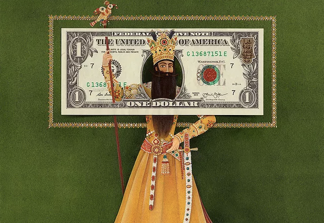Fath-Ali Shah Qajar is part of a larger series that the artist has undertaken to appropriate and subvert the most ubiquitous portrait in the United States: that of George Washington on the one dollar bill. Moreover, Khosravi couples this desire with her careful study of the Ottoman, Persian, and Mughal traditions of miniatures, and more generally, Persian portraiture.